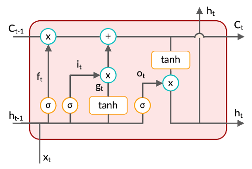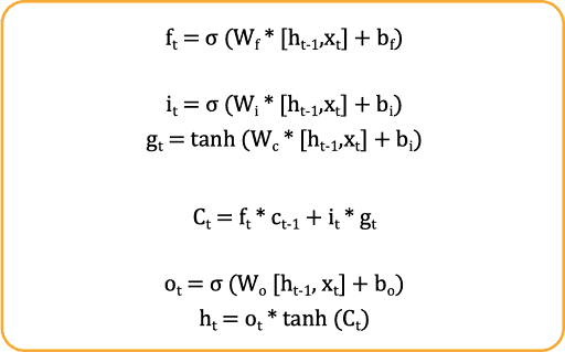 In the set of equations given above, the first one is a part of the forget gate, the second and third equations depict the functionality of the input gate, and the last two equations represent the output gate. The third-last equation denotes the cell state update at time step ‘t’.