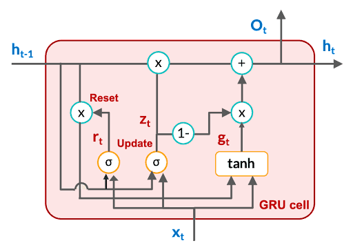 Like LSTM, GRU also has gates, but there is no external memory like cell state in the GRU architecture. GRU has two gates: the reset gate and the update gate.