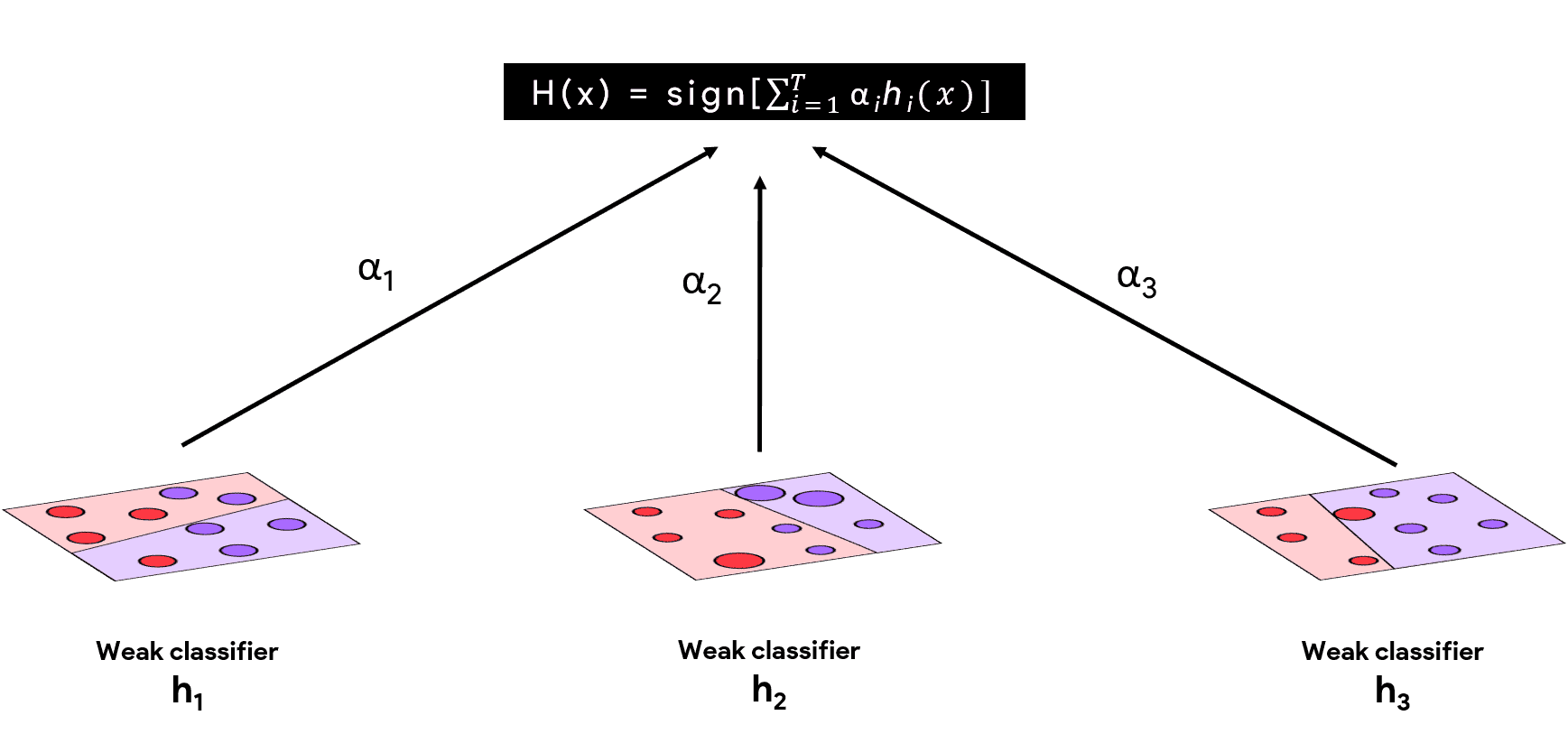 - In the end, you need to take a weighted sum of the predictions from all these weak learners to get an overall strong learner.