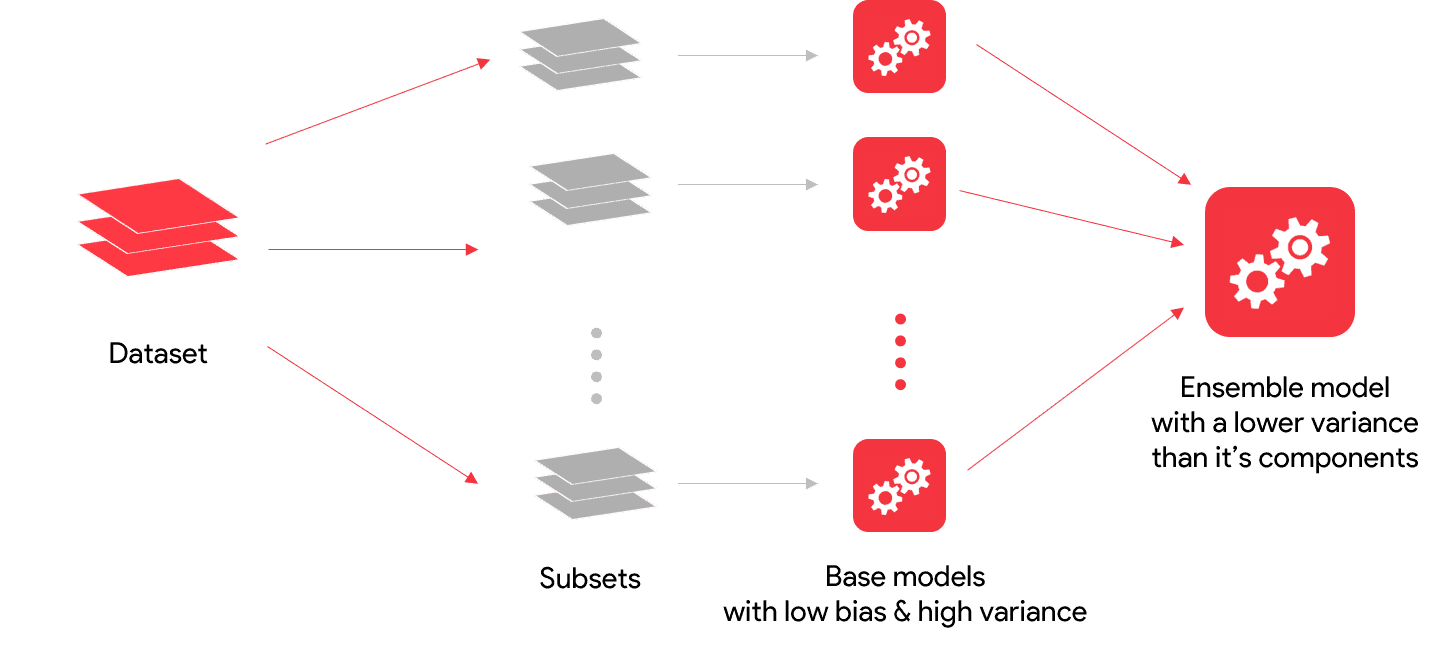 In this way, the same algorithm with a similar set of hyperparameters is exposed to different subsets of the training data, resulting in a slight difference between the individual models. The predictions of these individual models are combined by taking the average of all the values for regression or a majority vote for a classification problem. Random forest is an example of the bagging method.