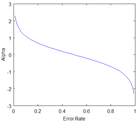 $\alpha = 0.5\ln\frac{(1-\text{Total Error})}{\text{Total Error}}$