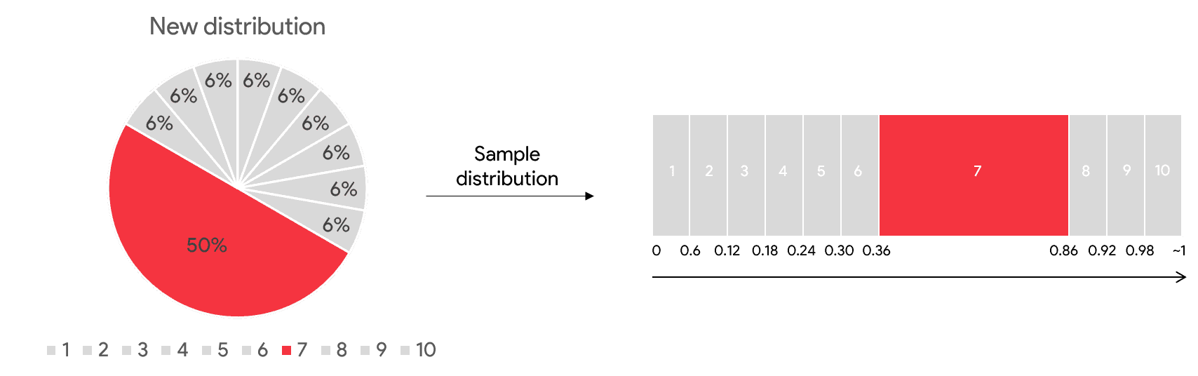 To fill our new empty dataset, we select numbers between 0 and 1 at random. The position where the random number falls determine which observation we place in our new dataset.